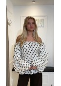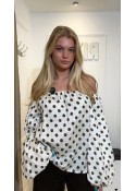 De top heeft lange wijde mouwen en is off-shoulder te dragen.