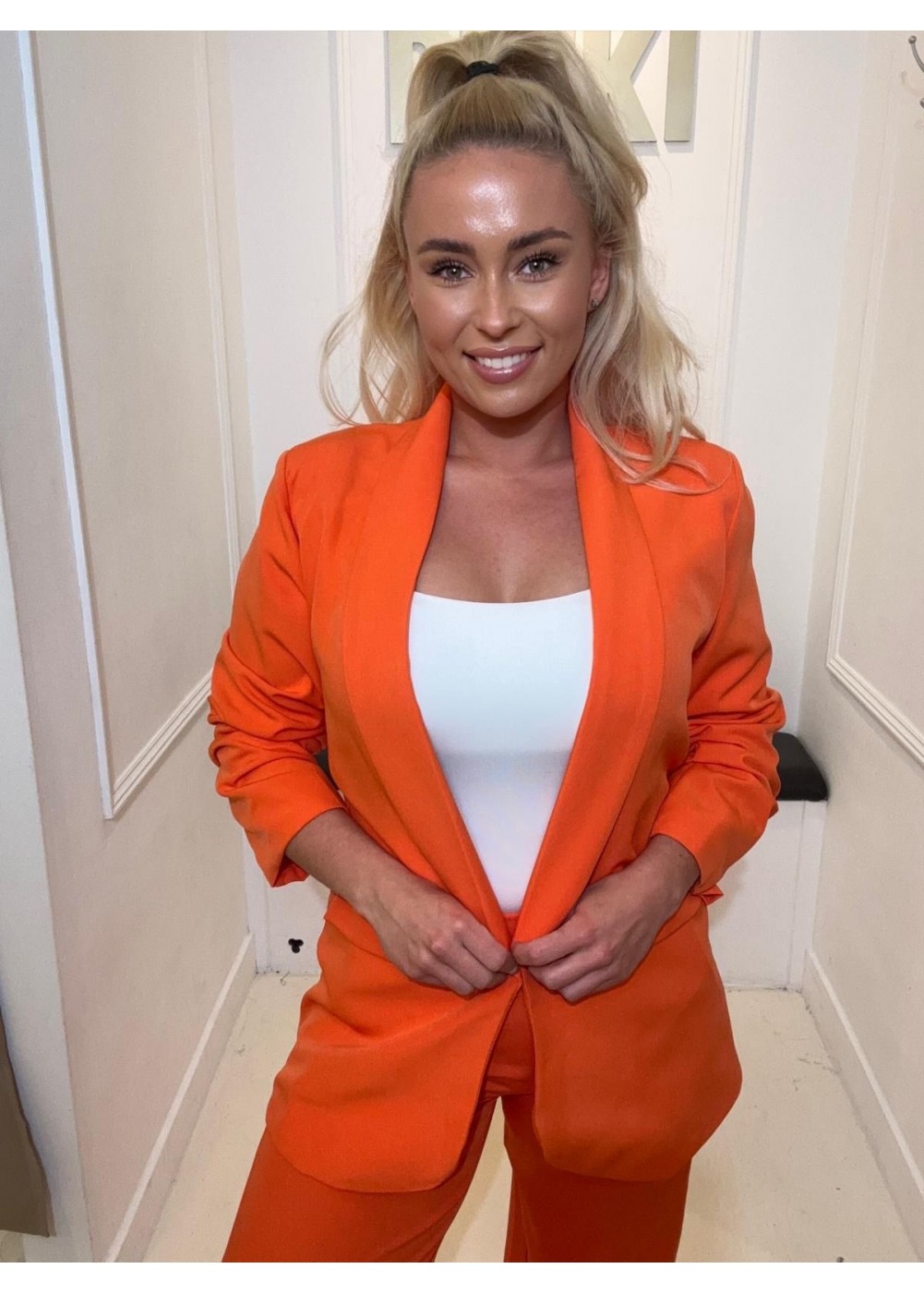 De blazer heeft een kraagje, schoudervulling en driekwart mouwen.