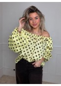 De top heeft lange wijde mouwen en is off-shoulder te dragen.