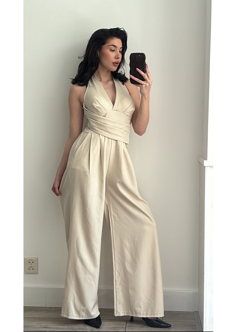Het jumpsuit heeft een V-hals, elastiek aan de achterkant en een halter bovenkant.