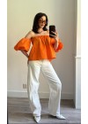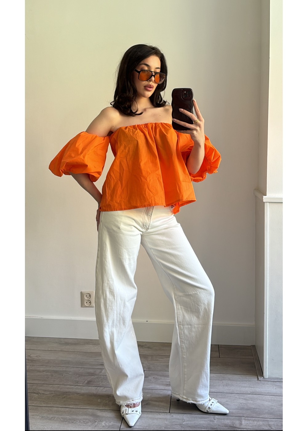 De top heeft een off-shoulder model met volumineuze pofmouwen.